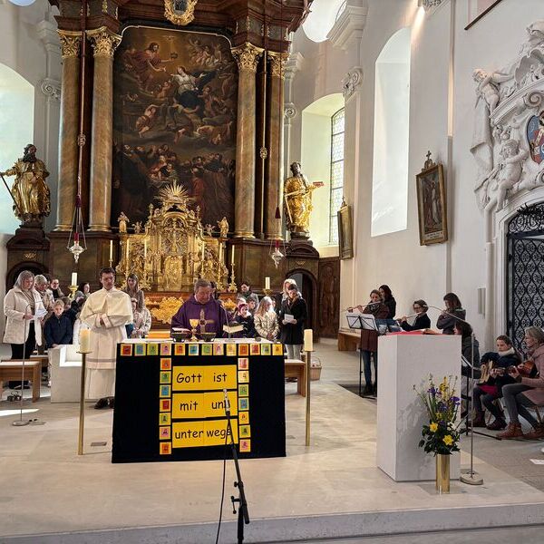 Am 6. April gestalteten die Kinder, welche am 29. Mai die Erstkommunion empfangen werden, mit den Tischeltern, den ReligionslehrerInnen und Musikern, den Gottesdienst. Er stand unter dem Motto: Gott ist mit uns unterwegs.